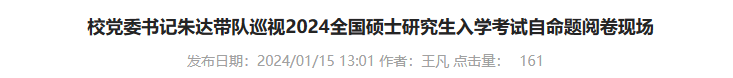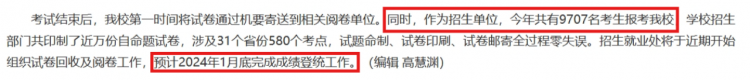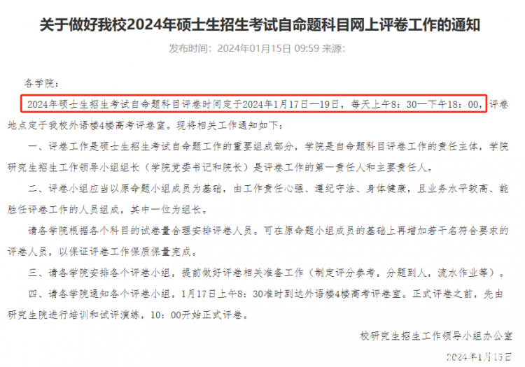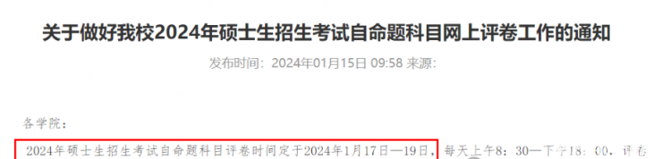 2024年硕士生招生考试自命题科目评卷时间定于2024年1月17日—19日。