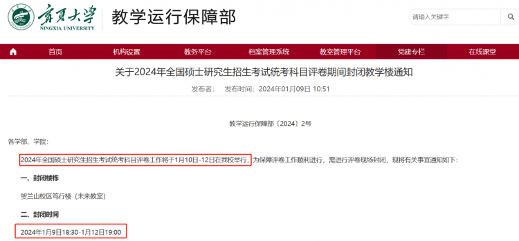 2024年全国硕士研究生招生考试统考科目评卷工作,将于1月10日-12日在我校举行,为保障评卷工作顺利进行,需进行评卷现场封闭。