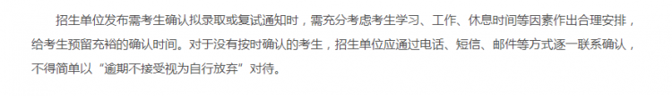 对于没有按时确认的考生,招生单位应通过电话、短信、邮件等方式逐一联系确认,不得简单以“逾期不接受视为自行放弃”对待。”